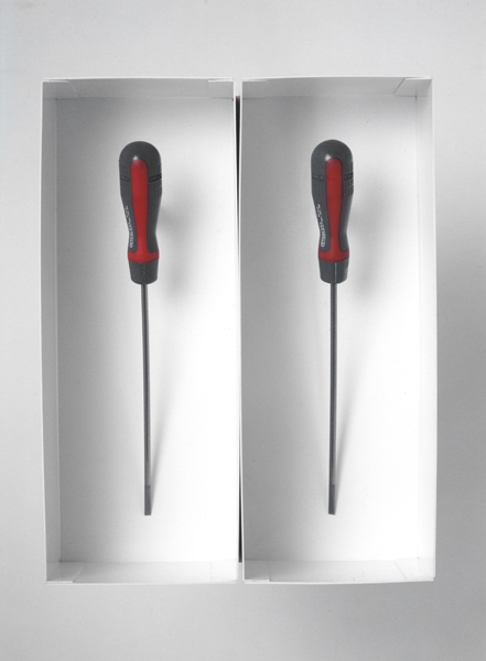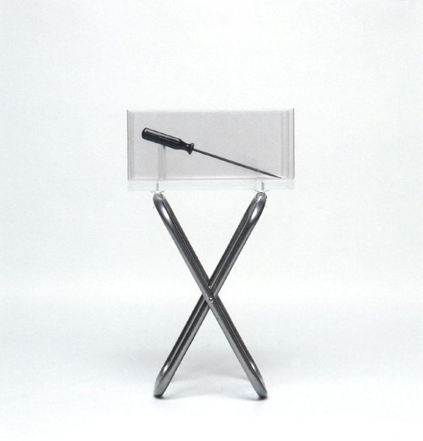 Visning, två versioner (del 2), 1996, 45×26,5×22 cm, pvc, stålrör, akrylglas, skruvmejslar
